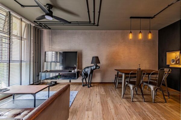 Featuring the PCI Toned Travertino Cement finish for this industrial-themed living room.